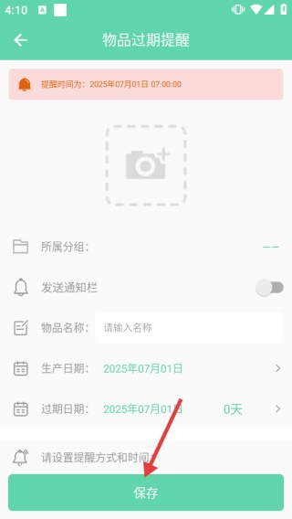 信息填写完毕后,点击【保存】按钮,即可创建新的临期提醒,避免物品过期。