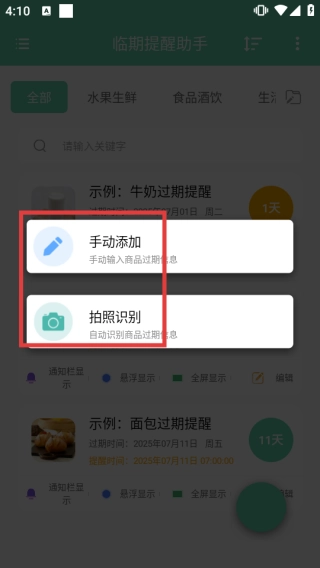 打开临期提醒助手,点击底部【+】,选择添加方式。