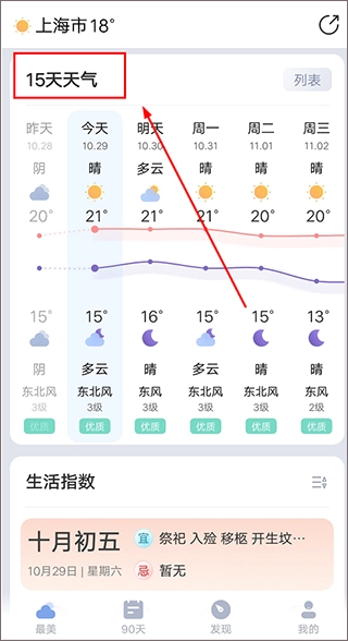 跳转到该城市的天气页面后,在页面内向下滑动,你就能在下方看到【15天天气】板块。