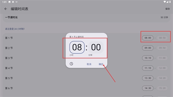 点击第1节的时间区域,在弹出的时间选择器中设置上课时间,确认无误后点击【确定】按钮,即可完成单节课的时间配置。