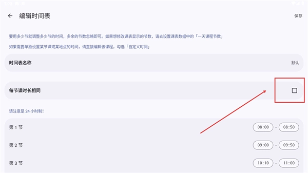 进入编辑时间表页面,勾选【每节课时长相同】的复选框,即可开启统一课时长的设置模式。