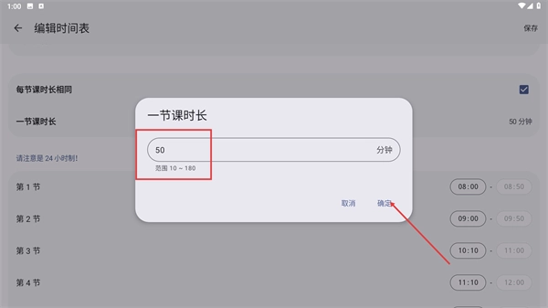 当【一节课时长】的窗口弹出后,请在其中设定时长数值(该数值需处于10至180分钟的区间内),随后点击【确定】按钮,即可完成此次设置操作。