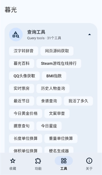 生活与查询工具:暮光百科、实时票房、单位换算、星座查询、梗名生成器等多样的查询及娱乐工具。