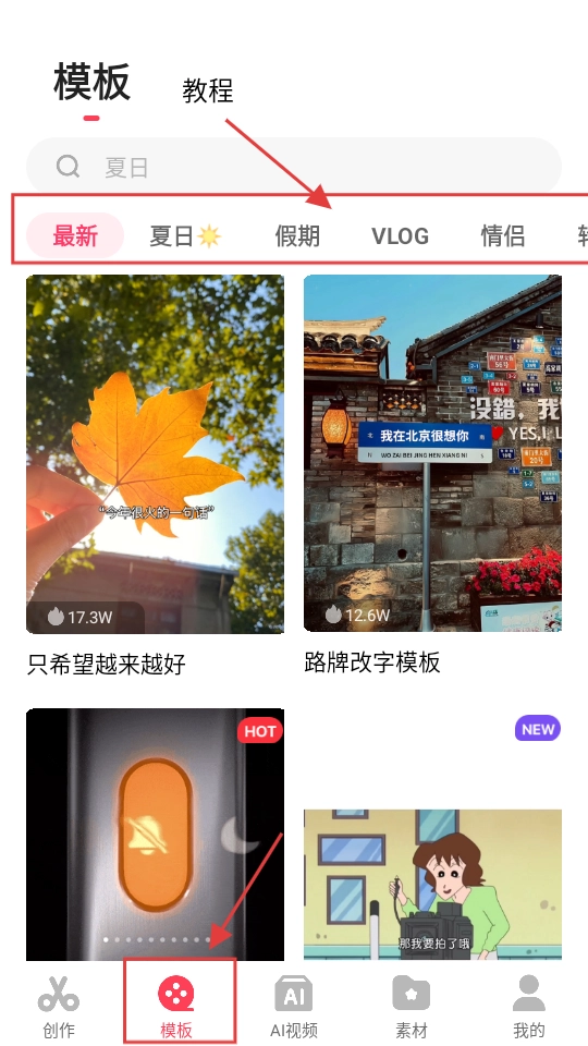 模板页面设有【最新】【夏日】等分类板块,同时包含大量丰富多样的模板资源。页面底部的【模板】按钮十分醒目,点击该按钮即可进入模板浏览界面,查看各类不同风格的模板。
