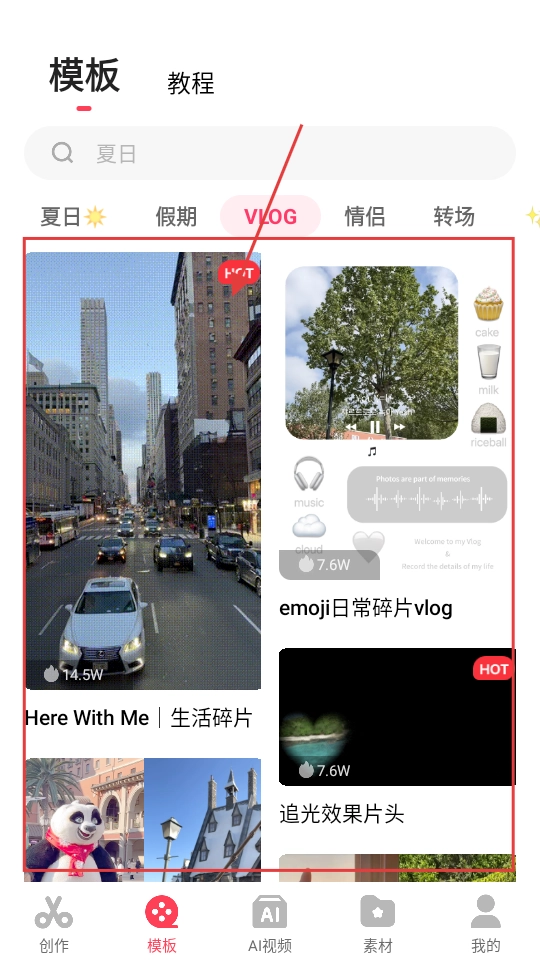 选【VLOG】分类,这里面有生活碎片、追光效果片头等模板,您可以挑选自己喜欢的,点击进去就能查看详情啦。