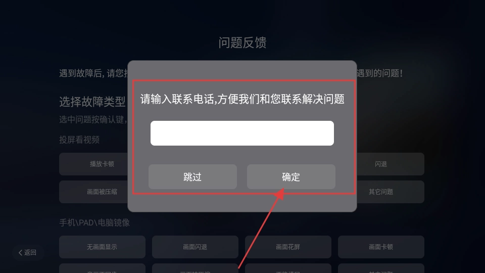 提交反馈后,您可以输入联系电话,然后点击【确定】或者【跳过】按钮,这样就完成问题反馈的流程了。