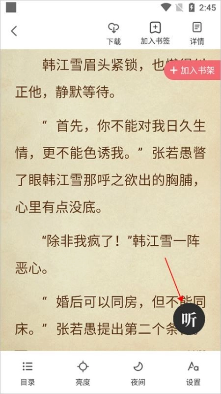 听书模式仅支持有语音包的小说,用户可进入小说阅读页面,点击右上角的菜单选项,若页面显示【听】图标(即下图红色箭头所指位置),则说明该小说可开启听书模式。