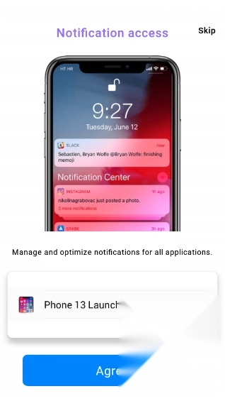 2、首次启动时会弹出通知权限请求,若希望模拟通知效果更逼真,点击“Agree”完成授权即可;若暂不想授权,选择“Skip”也能正常使用功能。