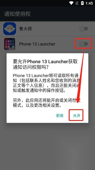 3、开启权限后,点击“Agree”按钮,系统会跳转至设置界面,以便开启通知使用权。