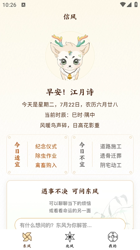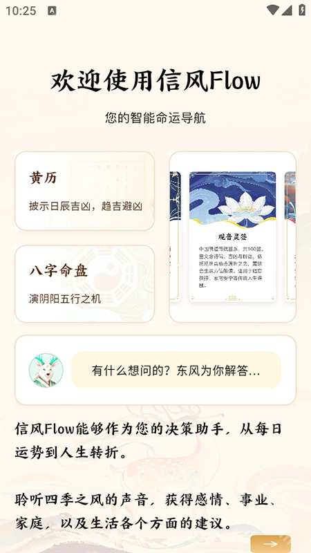 信风Flow是一款集成智能AI技术的线上运势测算工具。这款信风Flow手机应用将传统东方命理智慧与现代人工智能技术相融合,进入首页即可看到黄历、八字算命等丰富功能,在首页文字输入框中填写八字信息后,信风Flow安卓版就能迅速为你开展精准的命理分析,提供详尽的运势预测服务!