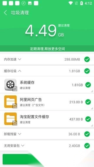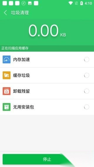 1、首次进入软件主界面后,点击垃圾清理功能,对手机的内存垃圾和结存垃圾进行扫描