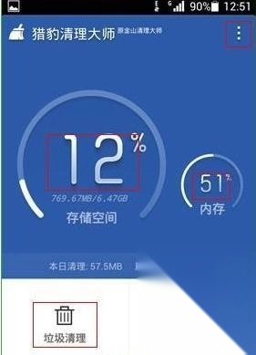 1、打开猎豹清理大师极速版软件,进入界面,布局简单明了,画红框的是能点击或设置的地方