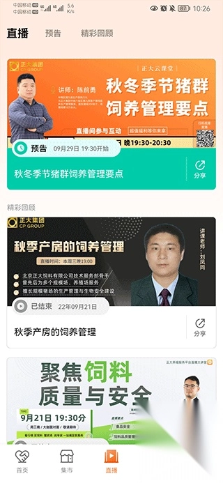 3、在直播界面中,用户还能在这里观看饲养管理要点、以及饲料质量与安全等直播来丰富自己的养殖知识