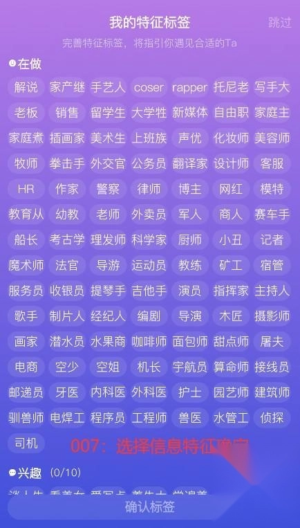 3、登录成功后,选择自己感兴趣的标签能帮助你更好地匹配对象