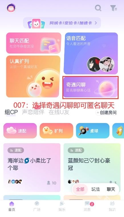 5、回到首页点击“奇遇闪聊”就能匿名聊天啦!