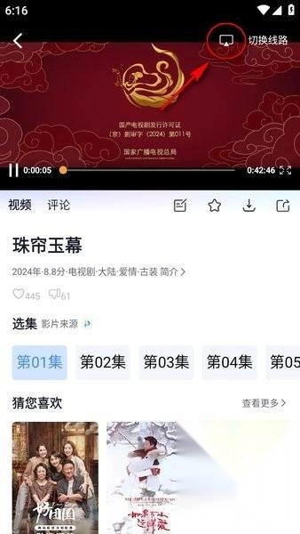进入播放页面后,在右上角“切换线路”的旁边有个电视图标,点击它就可以了。