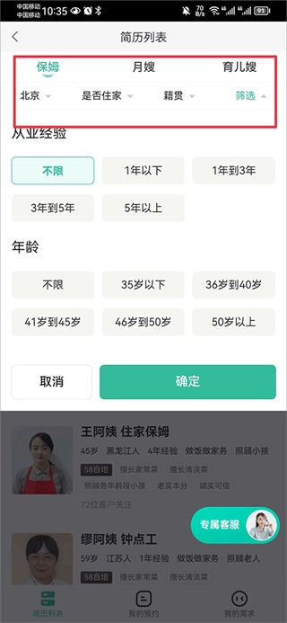 进入后,在简历列表里挑选保姆、月嫂或育儿嫂,接着在下方的筛选栏中选定你所需的标准。