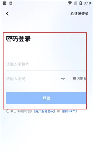 选择【手机登录】后,可在密码登录和验证码登录这两种方式之间进行切换,操作前需要先勾选用户协议与隐私政策。