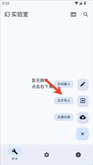 接下来打开幻实验室,进入脚本界面后点击右下角的添加按钮,再点击文件导入。