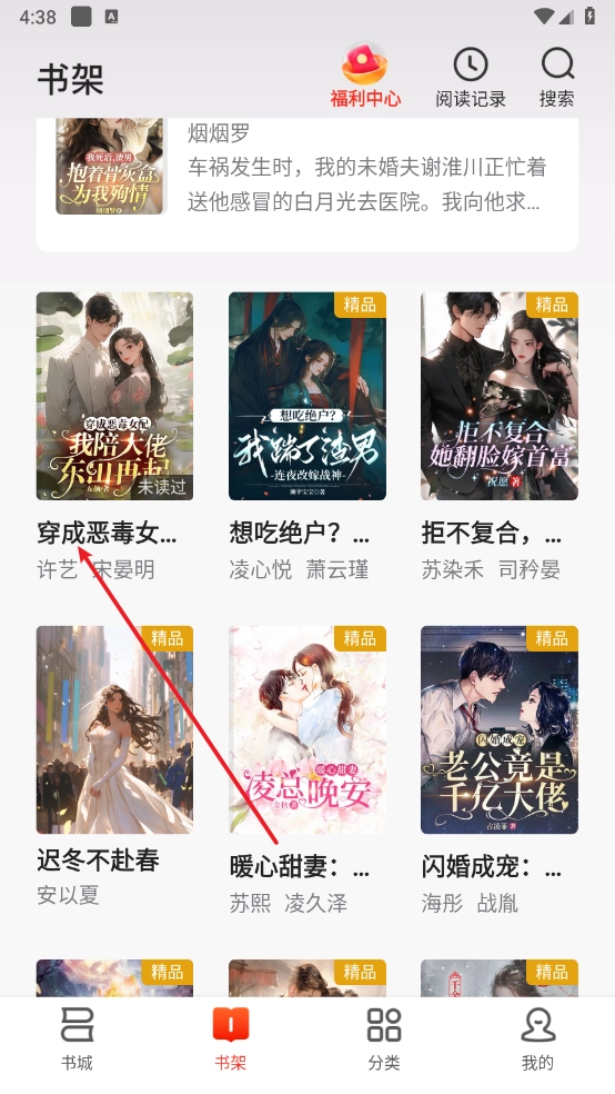 3、进入“书架”板块,就能看到收藏的小说资源了。