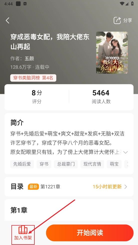 2、一键打开小说详情页后,点击左下角的“加入书架”按钮。