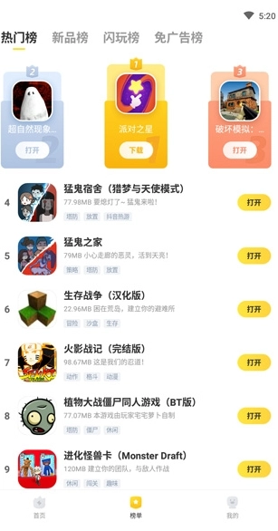 3、软件内设有各类榜单,你能够浏览这些榜单,了解其他玩家正在玩的游戏,进而发现自己感兴趣的游戏。