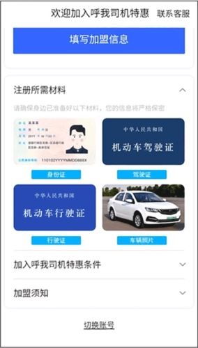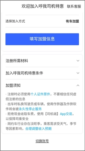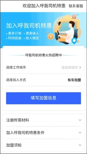 2、进入招募页面,点击成为呼我司机,然后按照步骤操作即可加盟。
