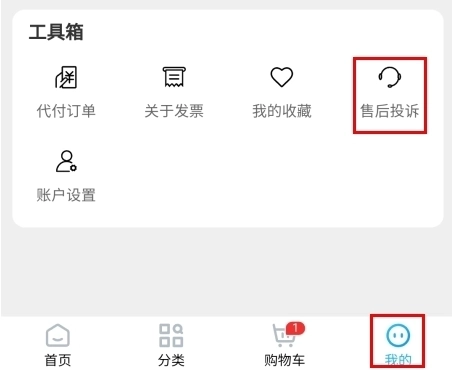 3、还能以投诉的方式联系会员,操作步骤是点击“我的”页面,进入售后投诉板块;