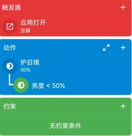 每个动作也可以单独加上限制条件,自动化软件最怕的就是在不想运行的时候自己操作,MacroDroid在这方面做得还是挺好的,响应速度也很快,像是到了夜晚打开软件自动开启护眼,这个就挺适合老司机熬夜啥的。