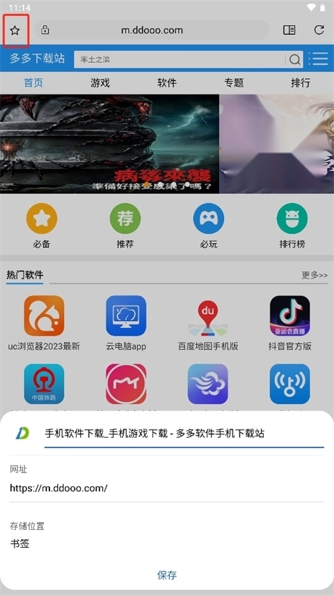 2、对于喜欢的网站可以点击下图的星星图标,可以将喜欢的网站快捷加入书签,以便用户下次直接进入页面