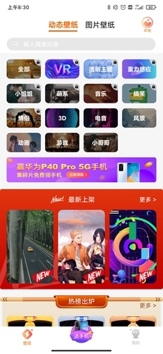 首先我们启动软件,这款软件的功能划分相当简洁明了,首页展示着各类壁纸和分类导航栏,中间那个抽手机的活动板块我们暂时不用关注。