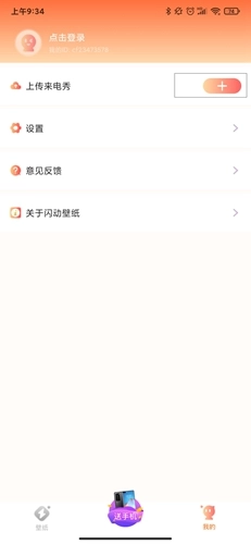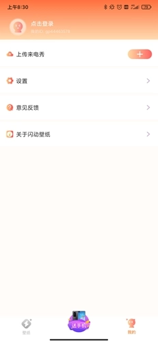 不少用户自己手头也有挺好的素材,想做个来电秀却不清楚制作方法,接下来我就给大家讲讲具体步骤。第一步,打开闪动壁纸APP并进入个人主页,接着找到页面里的上传按钮点击它。