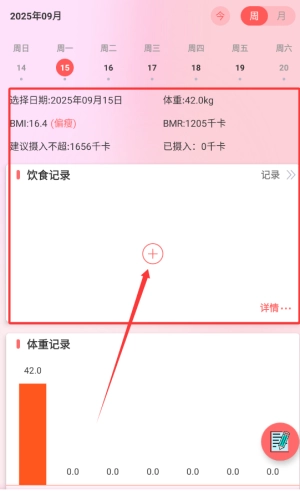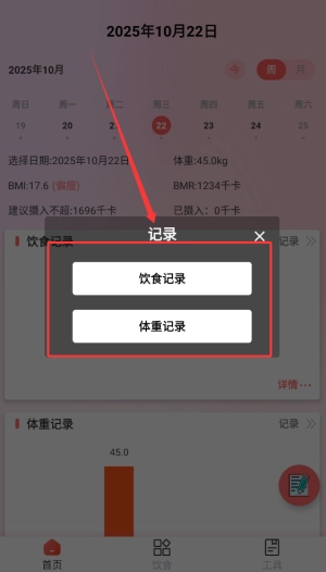1、借助首页功能能够记录每日饮食摄入状况和体重变化信息,从而建立健康档案。