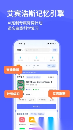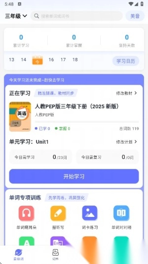 当完成相关内容的填写操作后,进入该软件的单词学习界面,能够发现多种不同类型的学习辅助功能。