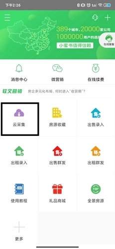 对于房产经纪人而言,房源的重要性不言而喻,那我们该如何获取房源呢?第一步是打开相关软件,找到并点击其中的云采集功能,之后就能浏览到大量的房产信息了。