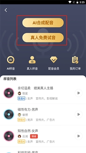 3.选择上方的AI合成配音或真人免费试音按钮即可