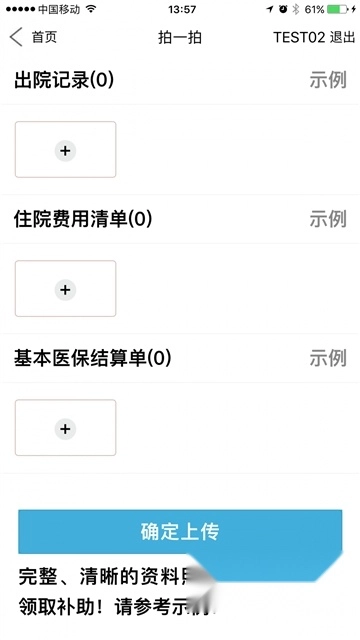 支持通过相机实时拍摄并上传文件,可用于记录出院情况、费用明细以及结算凭证等材料。