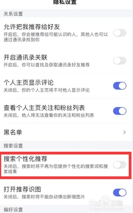 进入隐私设置界面后,找到“搜索个性化推荐”选项,点击其旁边的开关按钮将其关闭。