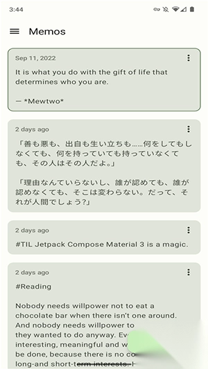 MoeMemos是一款功能十分强大的备忘录应用。不管是学生想要记录学习心得,职场人希望捕捉工作里的突发灵感,还是写作爱好者想随时记下生活中的感悟,这款应用都能成为大家必不可少的实用工具,帮助大家随时随地记录各种灵感和想法。