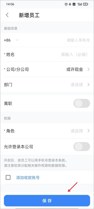 请输入员工的基本信息与岗位信息,填写完毕后点击下方的“保存”按钮即可。