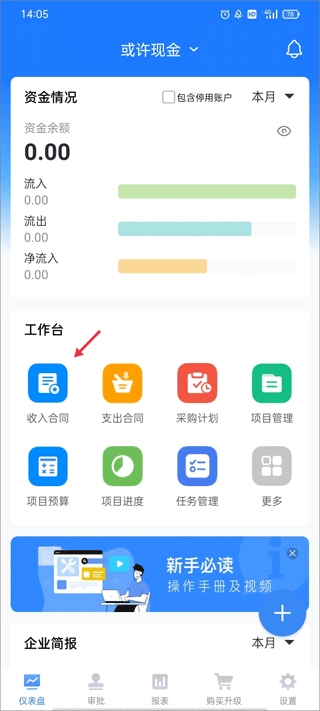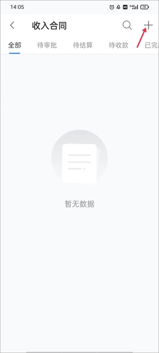 该区域可呈现各类状态的收入合同清单,若需添加新内容,点击右上角的加号按钮即可完成新增操作。