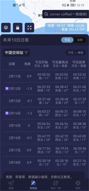 在特定板块中,你能查询到多个关键人造天体在本地天空的可见时段,涵盖了不同国家的空间站以及知名太空望远镜。借助这些时间信息,你可以对我国自主研发的空间站进行观测追踪。另外,该板块底部还提供了一批著名恒星的详细信息,包括它们的方位、运行状态以及视星等相关参数。