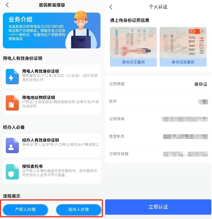 点击下方的“产权人办理”或“经办人办理”选项时,通常需要先完成“个人认证”,这一步一般要求上传身份证的正反面照片。