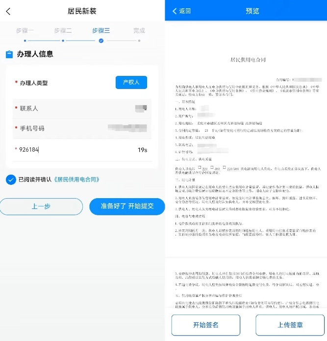 完成步骤三时,需先获取并填写验证码,接着签署相关供用电协议,所有操作确认无误后点击提交按钮即可。