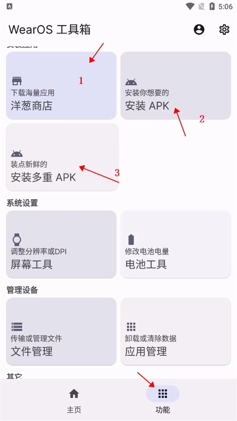 用工具箱完成手表的连接操作后,找到并点击功能栏区域,其中排列的首个选项为洋葱商店,第二个是本地APK安装功能,第三个则是多重APK相关选项。