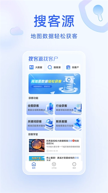 获客精灵是长沙富贵竹网络科技有限公司推出的企业营销获客专用软件,依托大数据分析实现潜在客户的精准定位,为企业提供线索挖掘、客户管理与营销推送的一站式服务,其界面设计简洁高效,操作流程简单便捷,欢迎有需求的用户前来体验。