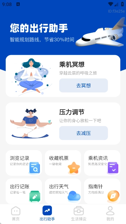 在出行助手页面里,我们为用户提供了乘机冥想、压力调节、机票收藏、乘机资讯、出行记账以及指南针等实用功能。