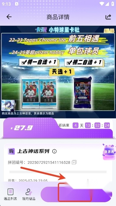 选好心仪的球星卡包后,用户只需点击“立即购买”按钮,就能完成快速下单流程。