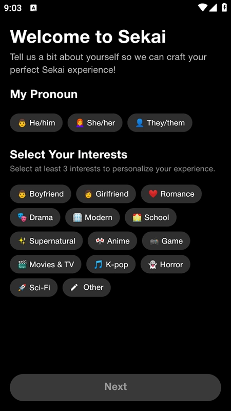 在这个平台上完成软件的安装与启动操作后,需先选定个人的性别信息,再从兴趣类别中挑选出不少于三个选项,所有设置确认无误后,点击界面上的“Next”按钮即可进入下一步。