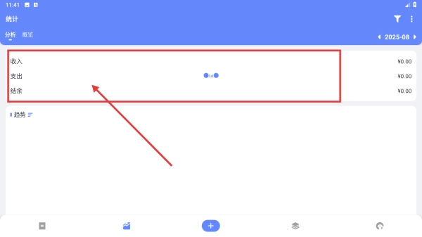 进入统计界面后,可浏览收入、支出及结余的相关数据,以此对财务状态进行剖析,随后点击查看收入详情。